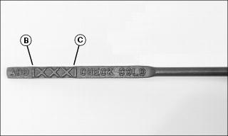 4. Remove dipstick and check oil level. Oil level should be between the minimum (B) and maximum (C) lines.