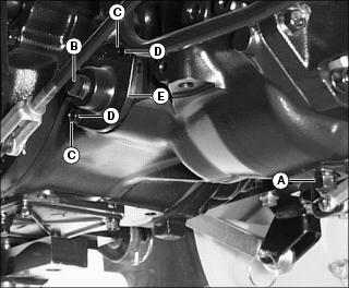 5. After oil is drained, remove two cap screws (C) and lock washers (D) to remove suction screen cover (E).