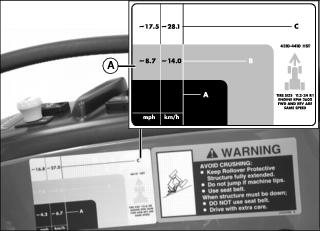 c CAUTION: Avoid injury! Use caution when operating machine at transport speeds. Reduce speeds if towed load weighs more than machine. Consult towed equipment operator's manual for recommended transport speeds.