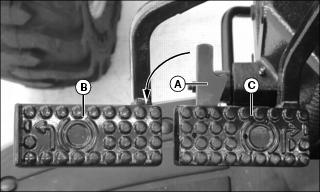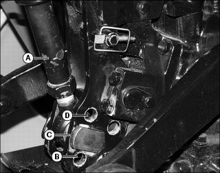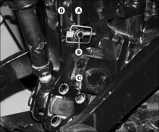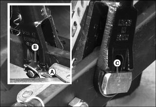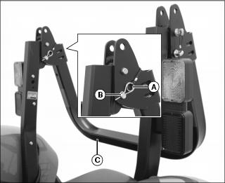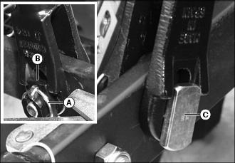 4. Install drilled pins (B) and spring locking pins (A) to lock crossbar (C) in the lowered position.