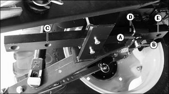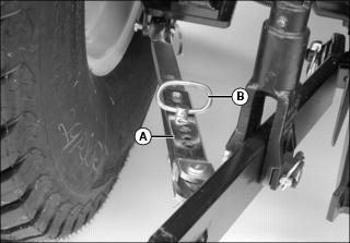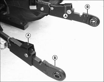 2. Install additional attaching points (B) for the chain on drawbar to reduce slack in chain when necessary.