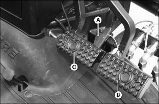 6. Make sure brake pedals are locked together with the brake pedal latch to slow or stop machine.