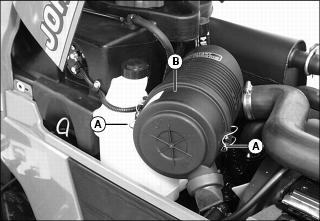 4. Release latches (A) and remove air cleaner canister cover (B).