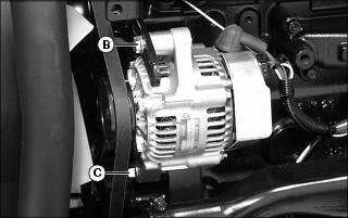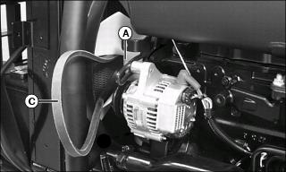 8. Remove belt (C) from alternator sheave, fan sheave and crankshaft sheave.