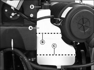 6. Check oil level on dipstick; oil level should be between levels (B) and (C) on dipstick.