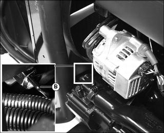 6. Remove all dirt and debris from radiator fins (A) and fan shroud (B) using compressed air or water.