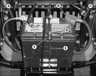 4. Connect the other end (F) of negative (-) booster cable to a metal part of the disabled machine frame away from battery.