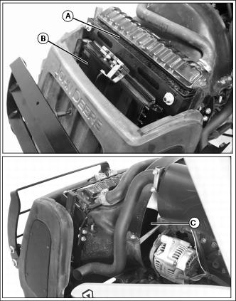 2. Remove all dirt and debris from radiator fins (A), oil cooler fins (B) and area (C) inside the fan shroud using compressed air or water.