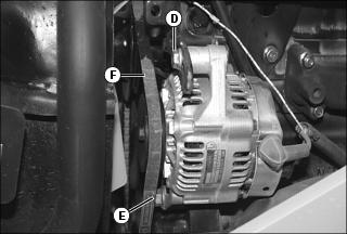 10. Remove belt (F) from alternator sheave, fan sheave and crankshaft sheave.