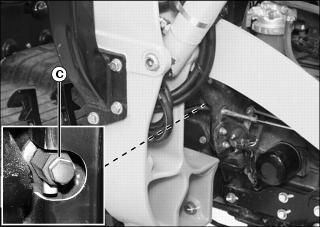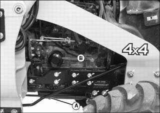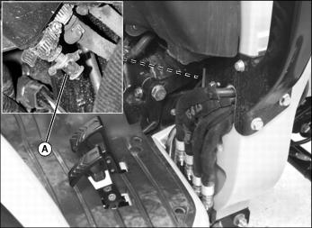 3. Locate petcock drain (A) in front of the travel pedals on the right side of the machine.
