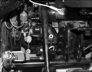 ˇ Remove oil fill cap (C). Add John Deere HY-GARD (JDM J20C) or equivalent oil at fill cap location.