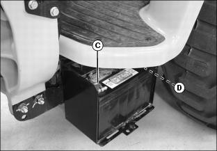 4. Push red cover back away from positive (+) battery cable (D) and remove cable from battery.