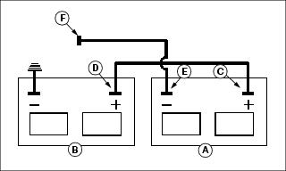 4. Connect the other end (F) of negative (-) booster cable to a metal part of the disabled machine frame away from battery.