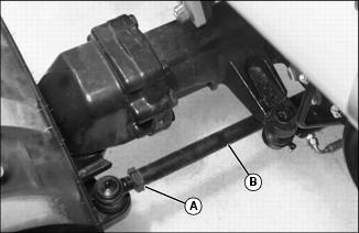 2. Rotate tie rod (B) clockwise or counterclockwise to adjust the amount of toe-in. Adjust tie rod until toe-in measurement is within correct specification.