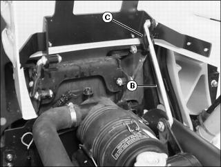 4. Raise hood until hood support rod (B) completely engages retaining clip (C).