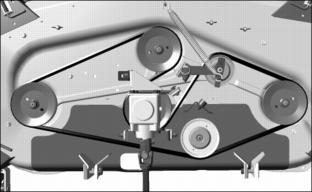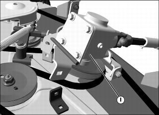9. Tilt gearbox (I) forward and remove deck drive belt.