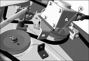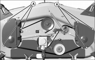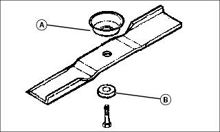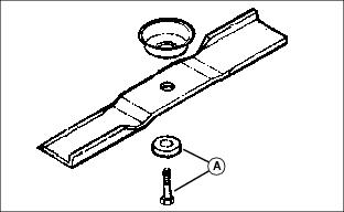 1. Check that deflector cup (A) is properly seated between mower spindle and blade.