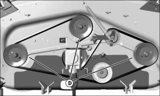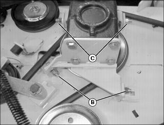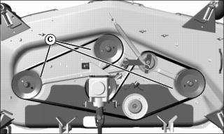 3. Clean top of mower deck and area around all of the sheaves (C) of debris.