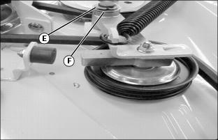 6. Remove clip (E) and washer (F). Lift idler arm up to remove belt.