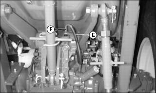 12. Remove hose (E) attached to vent tube (F) located behind operator's seat.