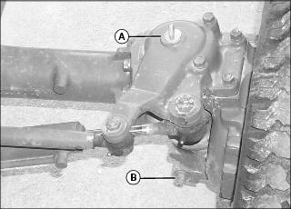 4. Positon drain pan under plug (B) at both sides of front axle. Remove plugs and allow oil to drain completely.