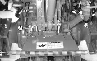 2. Remove dipstick (A) located behind seat. Wipe dipstick with a clean rag. Install dipstick and then remove to check oil level.