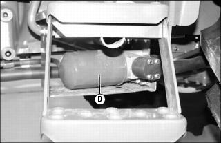 8. Place a drain pan under hydraulic oil filter (D) at left side of machine. Remove and discard filter. Allow residual oil to drain completely.