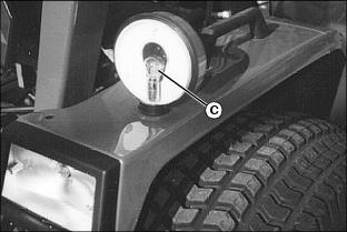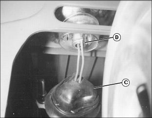 4. Pull back rubber protector (C) from assembly. Rotate headlight bulb assembly (D) left 1/3 turn and remove from headlight housing socket.