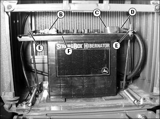 · Remove hex nuts (E) and bracket (F).