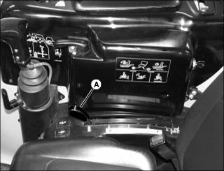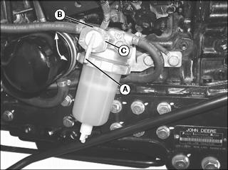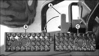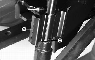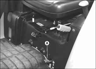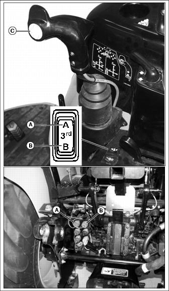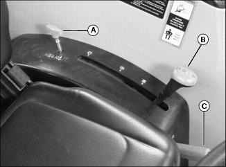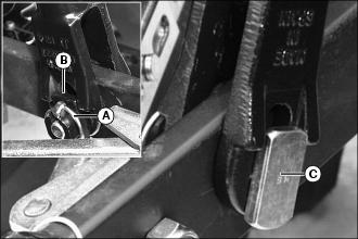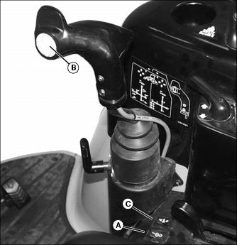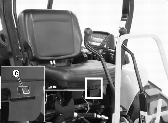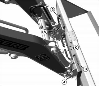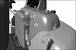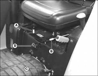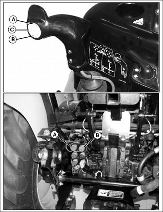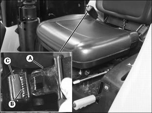 2. Remove capscrews (A) and washers (B) from seat cables (C) on rockshaft housing.