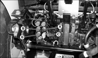 2. Connect tilt cylinder rod end hose to quick coupler (C) and the cylinder base end hose to quick coupler (D).