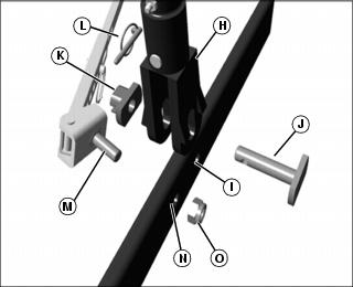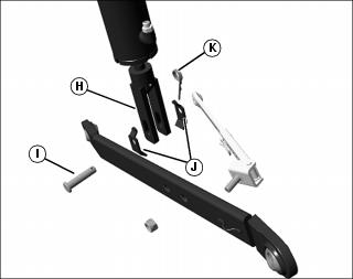 6. Fasten with drilled pin (I), stop brackets (J), and spring locking pin (K).