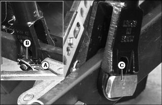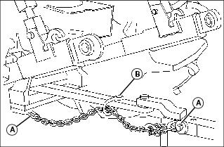 2. Install additional attaching points (B) for the chain on drawbar to reduce slack in chain when necessary.