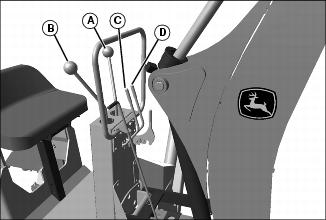 c CAUTION: Avoid injury! Do not use control levers to help you mount or dismount the backhoe. Always use hand rail. Do not operate controls while standing on the ground. Backhoe movements could strike and/or crush you against frame.