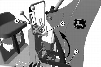 1. Pull lift rod (A) up and towards back of tractor, raising locking device (B) from pin on swing, and locking into latch (C).