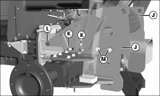 4. Install RSA mounting plates (J) onto mount weldments from rear of tractor. Avoid pinching electrical wires. Loosely install two M16x45 cap screws (K) and 5/8 in. washers in both RSA mounting plates.