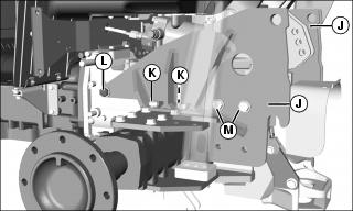 b. Tighten the four M12x55 cap screws (J) and two M12 hex nuts (K) to 95 N•m (70 lb-ft).