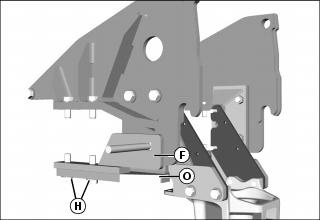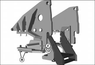11. Install pivot plate (F) between mount weldment (O) and bottom of tractor rear axle. Loosely install two M16x60 cap screws (H) and 5/8 in. washers removed earlier.