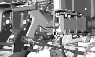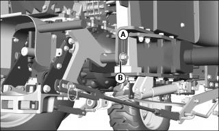 a. Remove and retain nut (A) and washer (B) from carriage bolt securing pivot plate to lift arm on both sides of tractor.