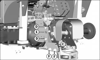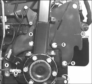 7. Install four new M14x45 cap screws (F) and 9/16 in. washers in hook weldments. Tighten to 40 N•m (30 lb-ft).