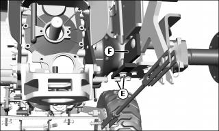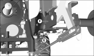 c. Remove M16x40 cap screws (E) and pivot plate (F) [including carriage bolt, washer, and spacer] from both sides of tractor. Retain cap screws for use with mower deck if RSA mounting plates are removed.