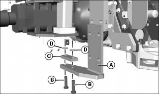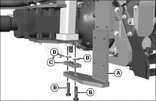 1. Install both mount weldments (A) in bottom of rear axle with two M16x60 cap screws (B), spacers (C), and 5/8 in. washers (D). Tighten to 40 N•m (30 lb-ft).