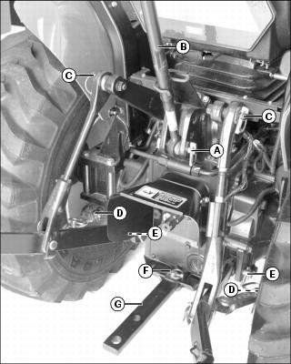 2. Install RSA mounting plates (E) onto mount weldments from rear of tractor. Avoid pinching electrical wires. Loosely install two M16x45 cap screws (F) and 5/8 in. washers in both mount weldments.