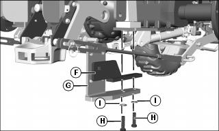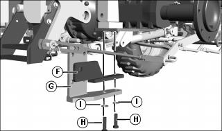 3. Install both mount weldments (G) and pivot plates (F) in bottom of rear axle with two M16x60 cap screws (H), and 5/8 in. washers (I). Tighten to 40 N•m (30 lb-ft).