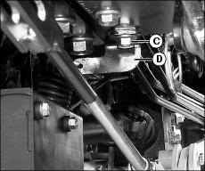 b. Tractor RH side only: Loosen ROPS bolt (C) and move spring bracket (D) out of the way.