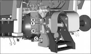 8. Tighten M12x55 cap screws (D) and M12 nuts (E) to 40 N•m (30 lb-ft).
