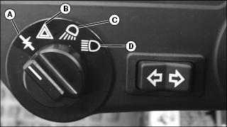 A -Warning Flasher/Turn Signal Indicator Light - This indicator light will turn on and flash when the light switch is turned to the warning flasher lights ON position, the headlights, taillights, and warning flasher lights ON position or the turn signal switch is moved to the right hand turn position.