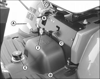 E - Engine Coolant Temperature Light - This light will turn on when the engine coolant is approaching a dangerously hot temperature. If this light turns on during operation, remove load on machine immediately. Reduce engine to idle speed and check for something blocking air flow to the radiator and check engine coolant level. If light stays on after cleaning grille, stop engine.