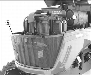 4. Lift tab (B) to slide radiator screen (C) up out of retaining slot.