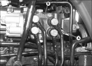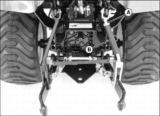 1. Secure the safety chain around the crossbar (A) that supports the lower draft arms (B).
